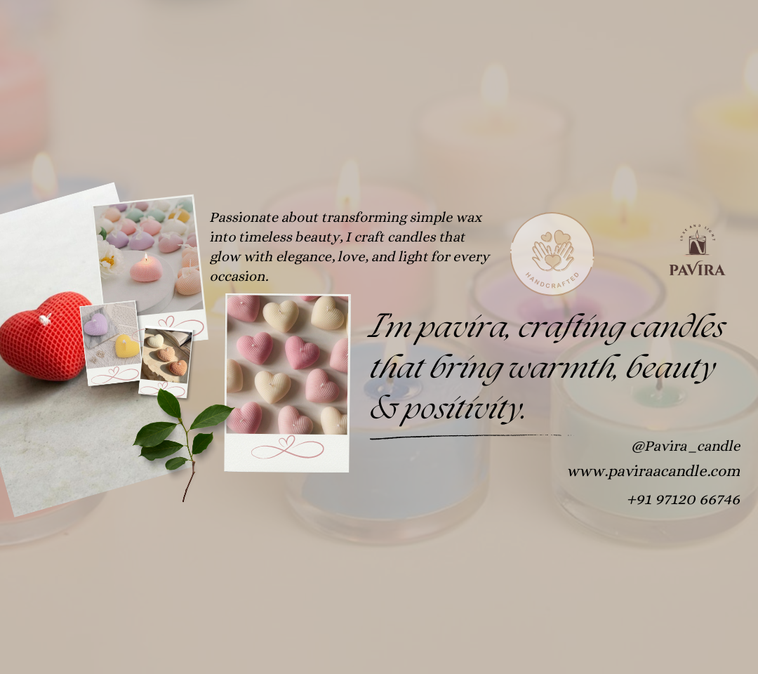 Pavira Candles welcomes you with a promise of light, luxury, and care. From the very beginning, our vision has been to create candles that go beyond fragrance candles that nurture well-being, bring warmth to every space, and remain kind to the planet. Each candle is thoughtfully handcrafted using natural waxes, pure essential oils, and eco-friendly wicks, ensuring a clean and safe burn without harmful chemicals. Our commitment to sustainability means every Pavira Candle reflects love for nature while adding elegance to your home. What started as a passion for mindful living has grown into a journey of spreading light in the most eco-conscious way. With Pavira Candles, you don’t just experience soothing fragrances and calming glows you become part of a movement toward a healthier, more sustainable world.